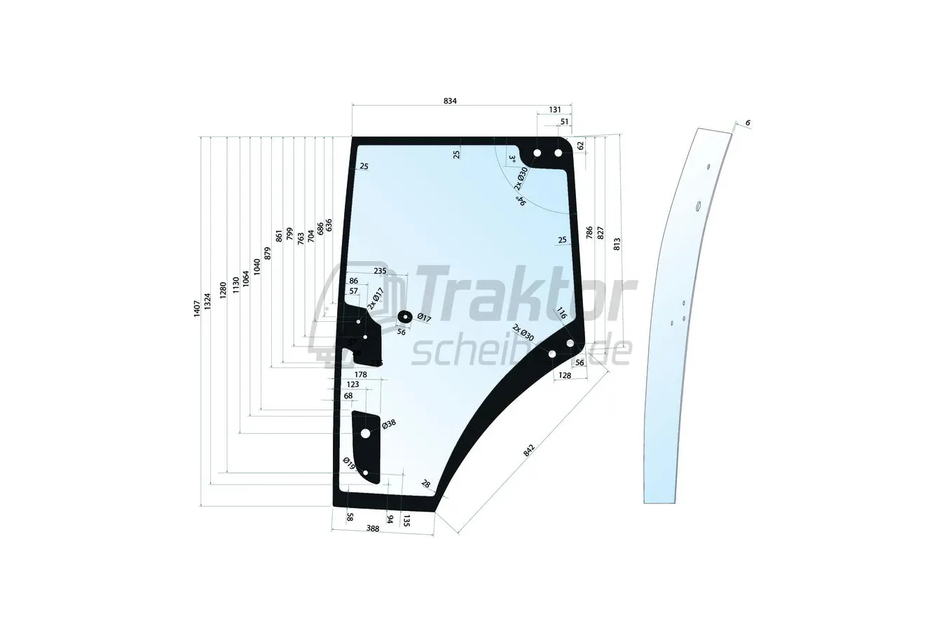 Diese getönte linke Türscheibe ist für den Türbereich der Kabine von FENDT Traktoren der 800er- und 900er-Serie vorgesehen. Sie wird mit 9 Bohrungen ausgeführt, ersetzt beschädigte oder fehlende Verglasung passgenau und sorgt für Schutz sowie angenehme Sichtverhältnisse im täglichen Arbeitseinsatz.