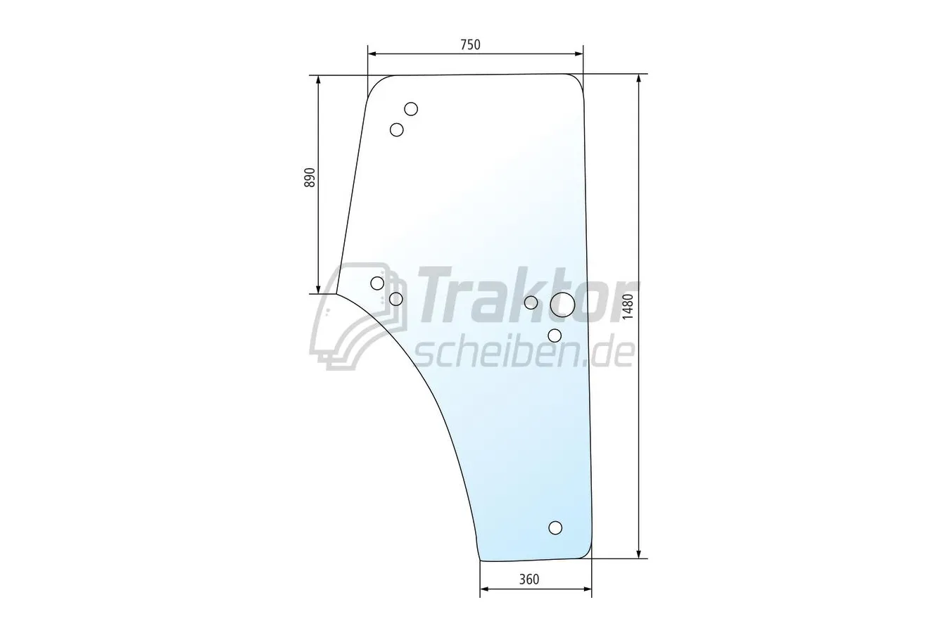 Diese Türscheibe ist für den rechten Türbereich von CLAAS-RENAULT Traktoren vorgesehen. Sie wird bei verschiedenen Ares-, Arion- und Axion-Baureihen eingesetzt und verfügt über 9 Bohrungen zur Befestigung bei entsprechender Kabinenausführung.